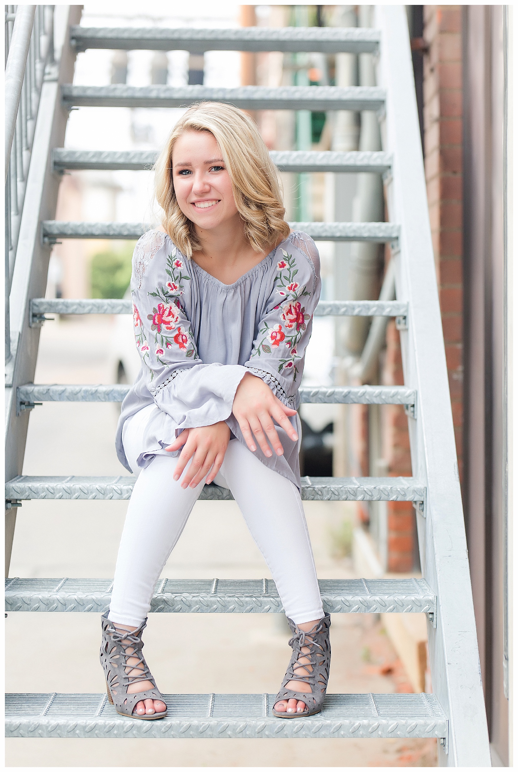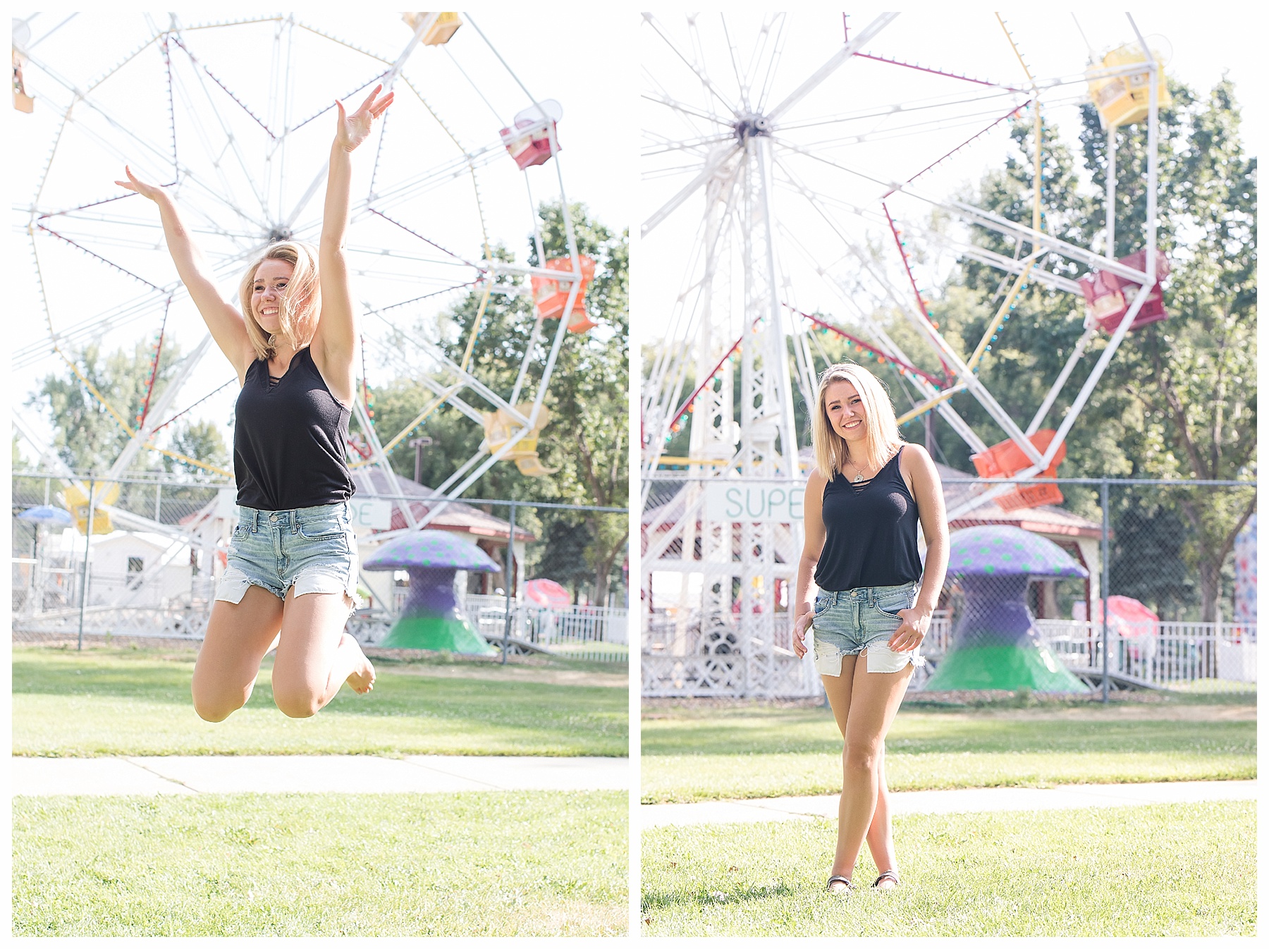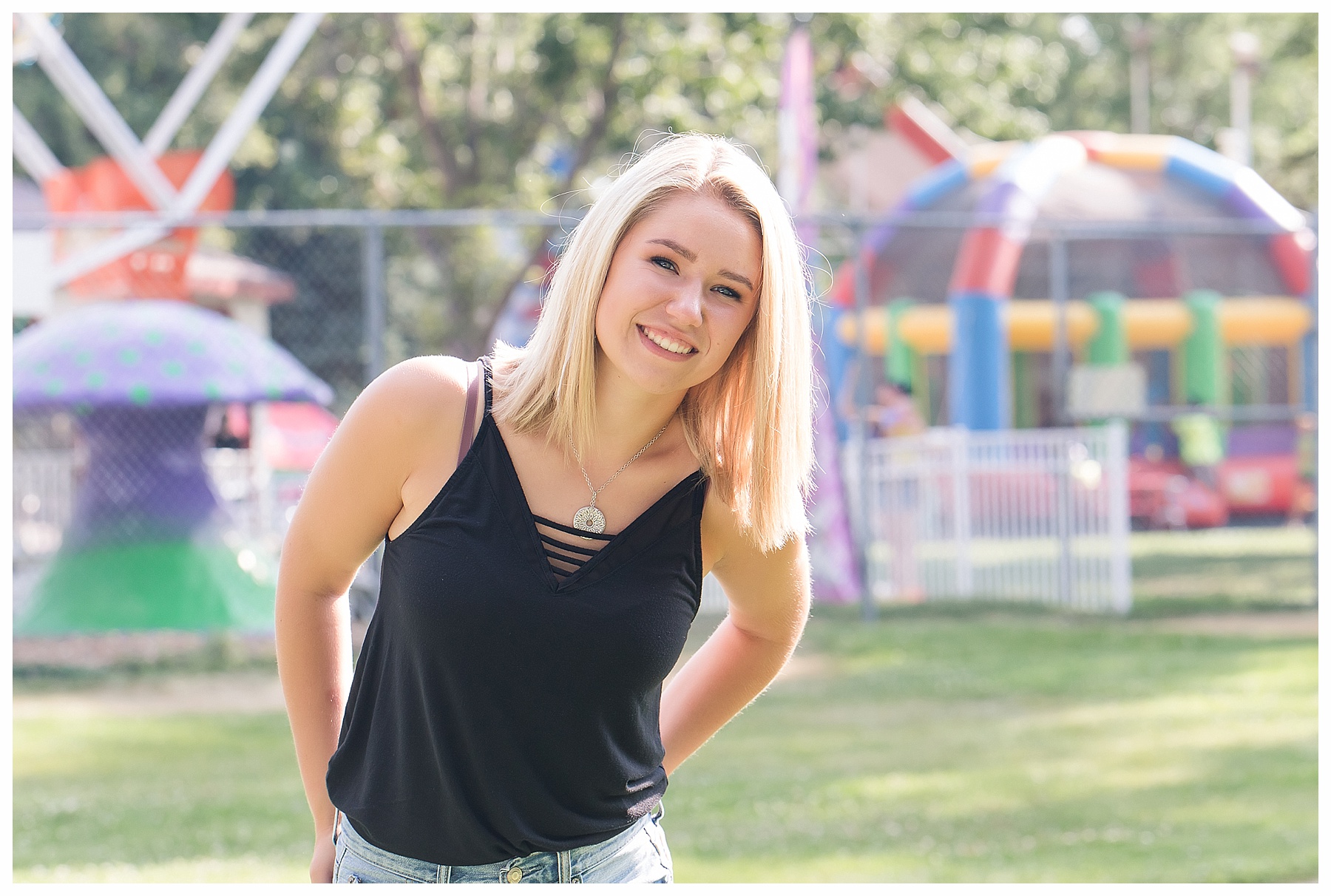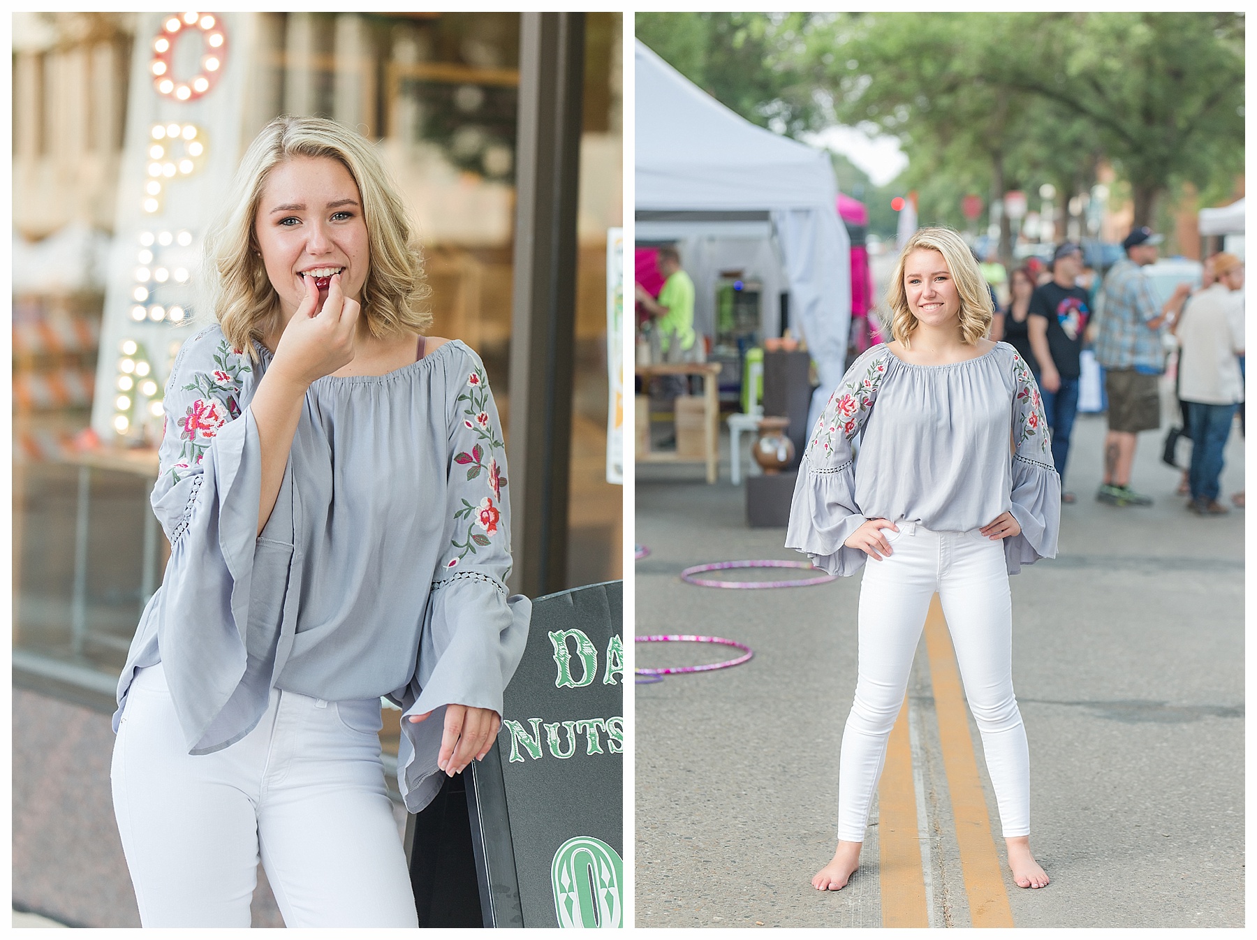There are just so many fun, pretty and unique places around Bismarck for senior pictures – and Mikayla and I tried to hit up as many spots as we could!  Senior pictures wouldn’t be complete without the iconic Heritage Center pictures.  The atrium is always beautiful and I loved Mikayla’s choice of outfit for this spot.  The light blues were perfection.  We also wandered through the museum a bit and found a few more picture perfect places.  Then it was off to find some pretty spots with the Missouri River in the background.  Check – and how cute is that hat?!  While we were down by the river, we made a quick stop by Sertoma Park and the SuperSlide Amusement Park for some fun stuff and for Mikayla to do a quick hair curl.  If you don’t mind a few curious onlookers, what’s wrong with curling your hair at the park?  :).  Then we headed downtown with all the cool old building, ally’s, and murals.  We were pleasantly surprised to find a small street fair and grabbed a couple of fun shots there.  And if you get the chance, be sure to stop at the Dakota Nuts and Candy! – A veteran owned business, that is super friendly and fun and generous with a tasty sample or two!