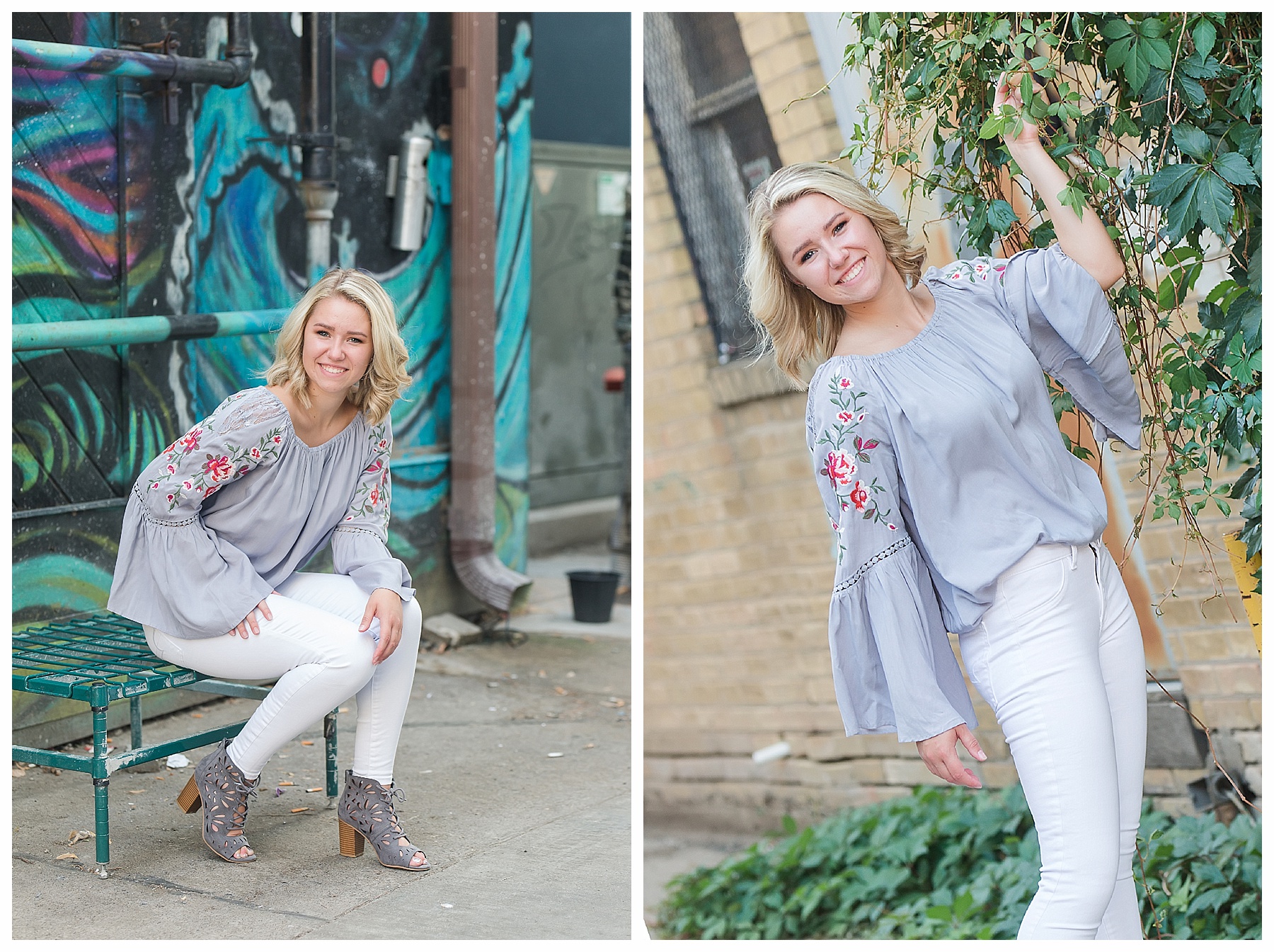 There are just so many fun, pretty and unique places around Bismarck for senior pictures – and Mikayla and I tried to hit up as many spots as we could! Senior pictures wouldn’t be complete without the iconic Heritage Center pictures. The atrium is always beautiful and I loved Mikayla’s choice of outfit for this spot. The light blues were perfection. We also wandered through the museum a bit and found a few more picture perfect places. Then it was off to find some pretty spots with the Missouri River in the background. Check – and how cute is that hat?! While we were down by the river, we made a quick stop by Sertoma Park and the SuperSlide Amusement Park for some fun stuff and for Mikayla to do a quick hair curl. If you don’t mind a few curious onlookers, what’s wrong with curling your hair at the park? :). Then we headed downtown with all the cool old building, ally’s, and murals. We were pleasantly surprised to find a small street fair and grabbed a couple of fun shots there. And if you get the chance, be sure to stop at the Dakota Nuts and Candy! – A veteran owned business, that is super friendly and fun and generous with a tasty sample or two!
