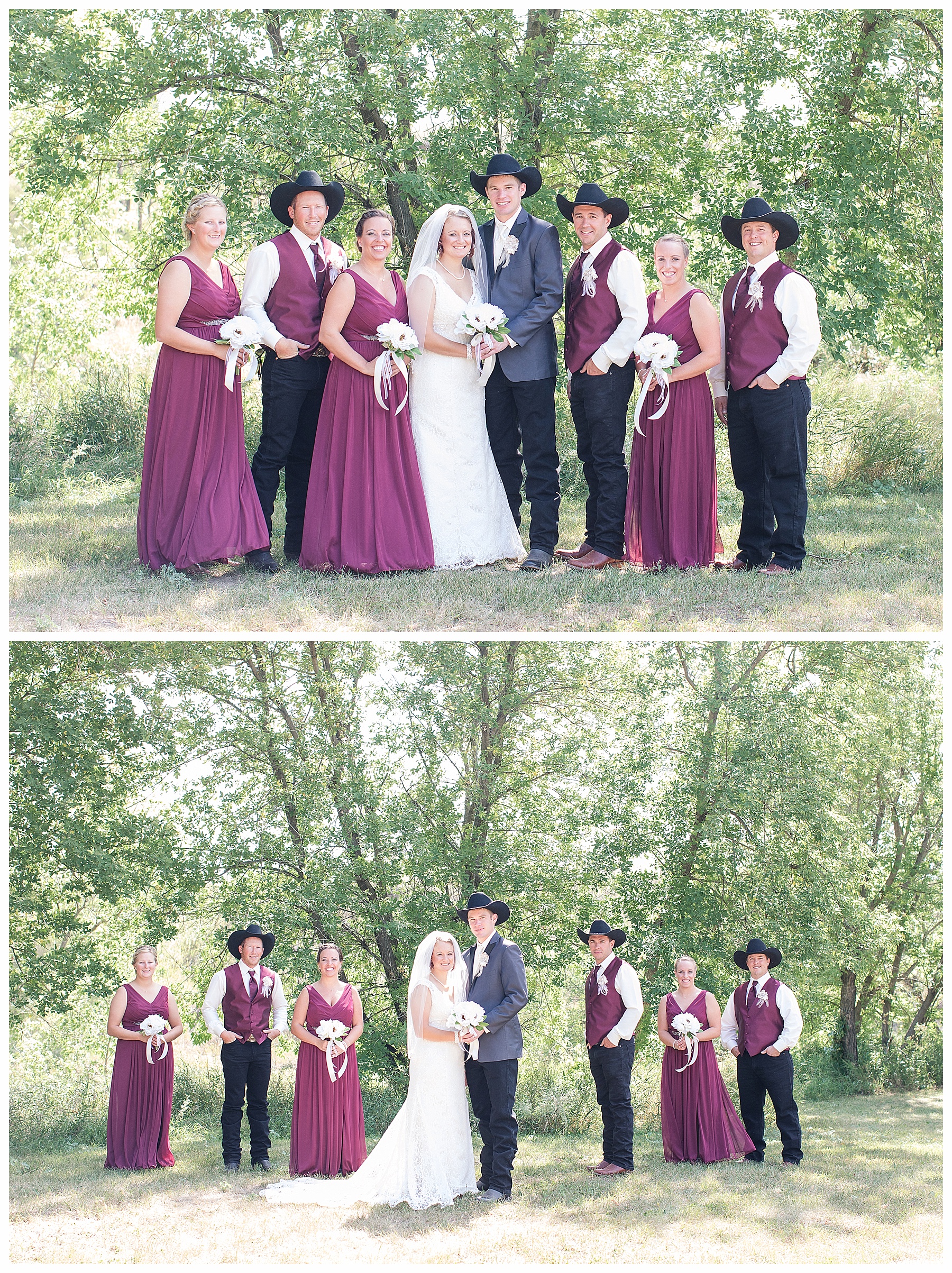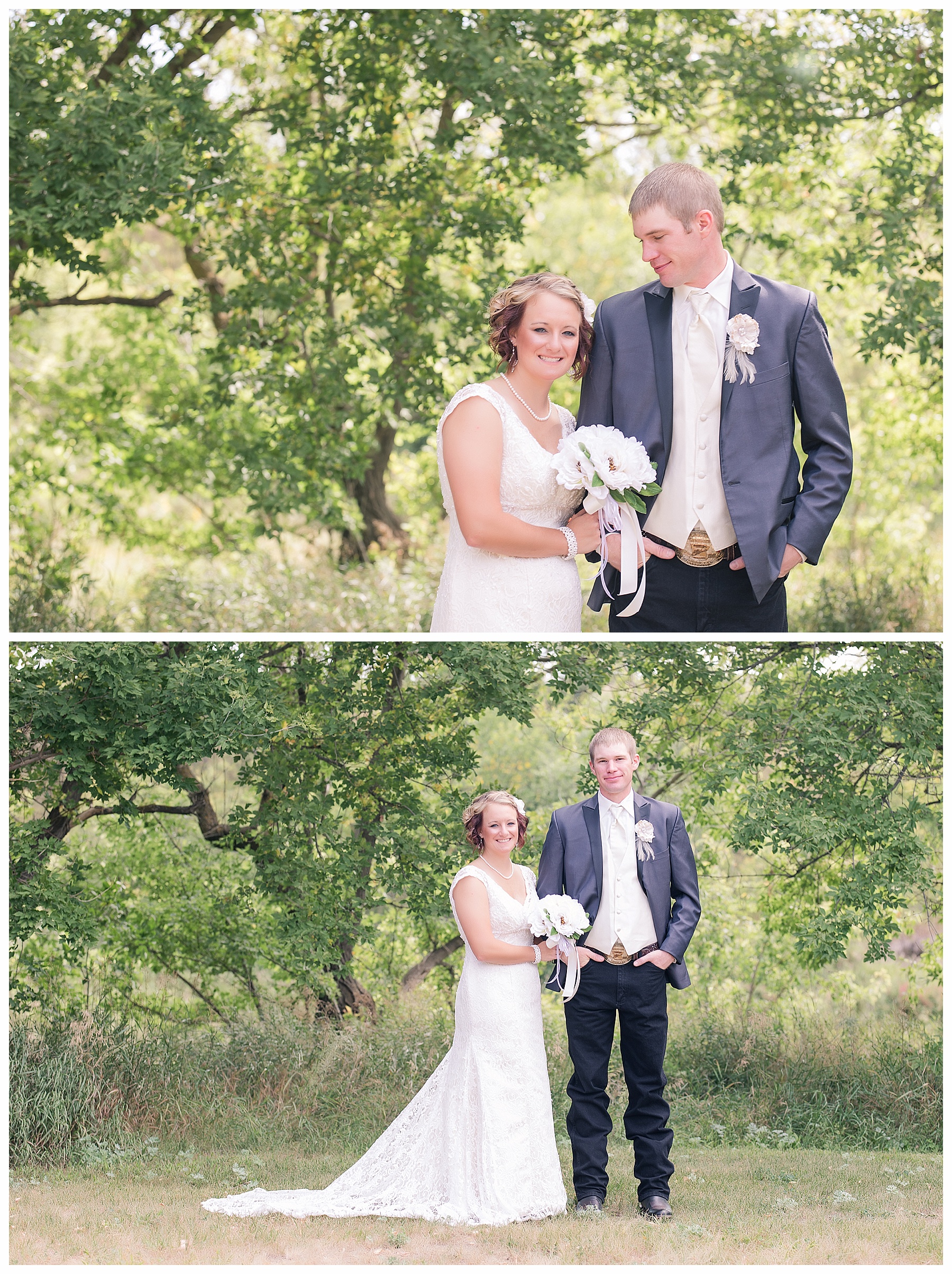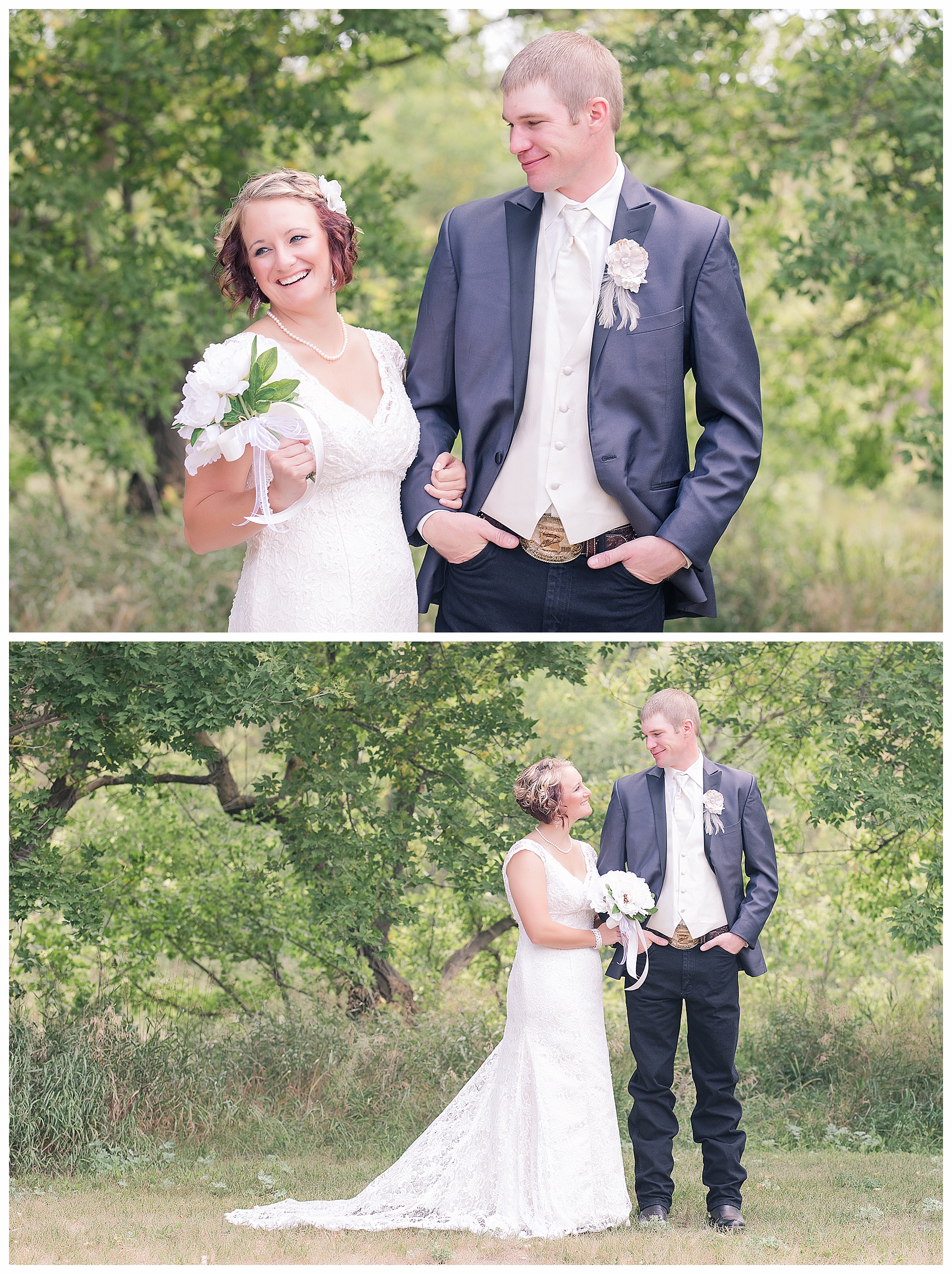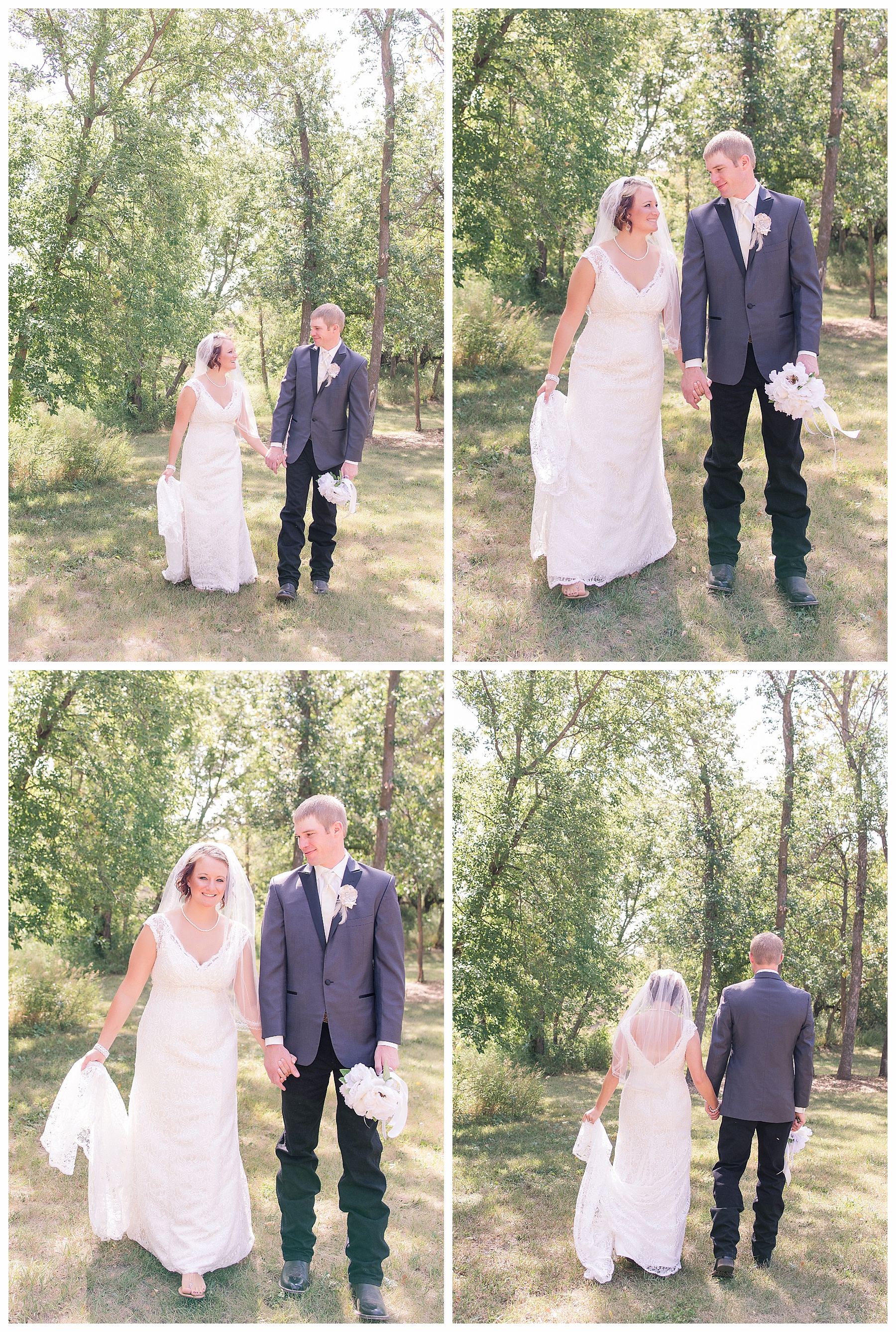 Another perfect wedding day in Hazen, North Dakota! Sunny and warm, a fun easy going group of friends, and a gorgeous happy bride and groom! Monica and Garrett – everything was perfect! We had such a pretty little spot in the church for Monica to put on her finishing touches and her girls to give her one last primp before heading to the park for our outdoor bridal portraits. The light in the park was just beautiful, sunny and filtering through the trees creating light, bright and joyful finished wedding pictures. The bride, her sisters and her best friend gathered round Monica, with hugs and laughs and genuine happiness for her. After the charming first look, the bride and groom photos were equally as beautiful with the sun and trees making perfect wedding portrait light. The guys had some fun and whole wedding party was just easy going and relaxed. Not much more that I could have asked for. After the ceremony, we all gathered to celebrate, eat, toasted dance with the new Mr. and Mrs. Grossman! Monica’s love of burlap and lace combined with Dodie’s (Found Events and Rentals) flawless talent for transforming a room with gorgeous decor, came together in a beautifully country chic feeling. Just a lovely North Dakota wedding day, start to finish!