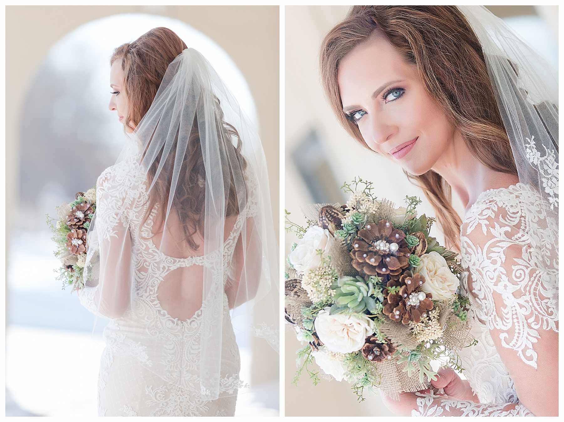 This past wedding season, all my brides wore headpieces and viels, though they each chose to do so in different ways. One chose not to wear her veil for first look or pre-ceremony photos. Her groom saw her for the first time in full bridal splendor walking down the aisle! Others wore their veils for photos and the ceremony, but took them off for the reception. Here’s a little look back at some of these stunning brides. If you scroll further down, you will find some additional examples of beautiful veils, headpiece and jewelry by JL Johnson Bridal Viels.