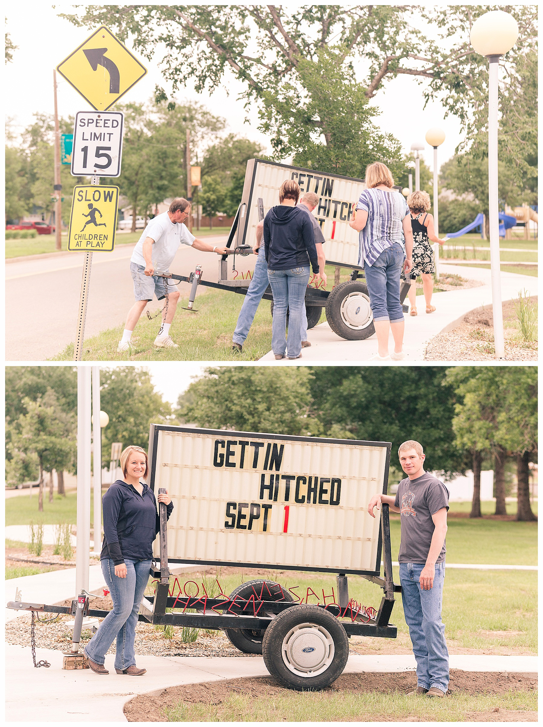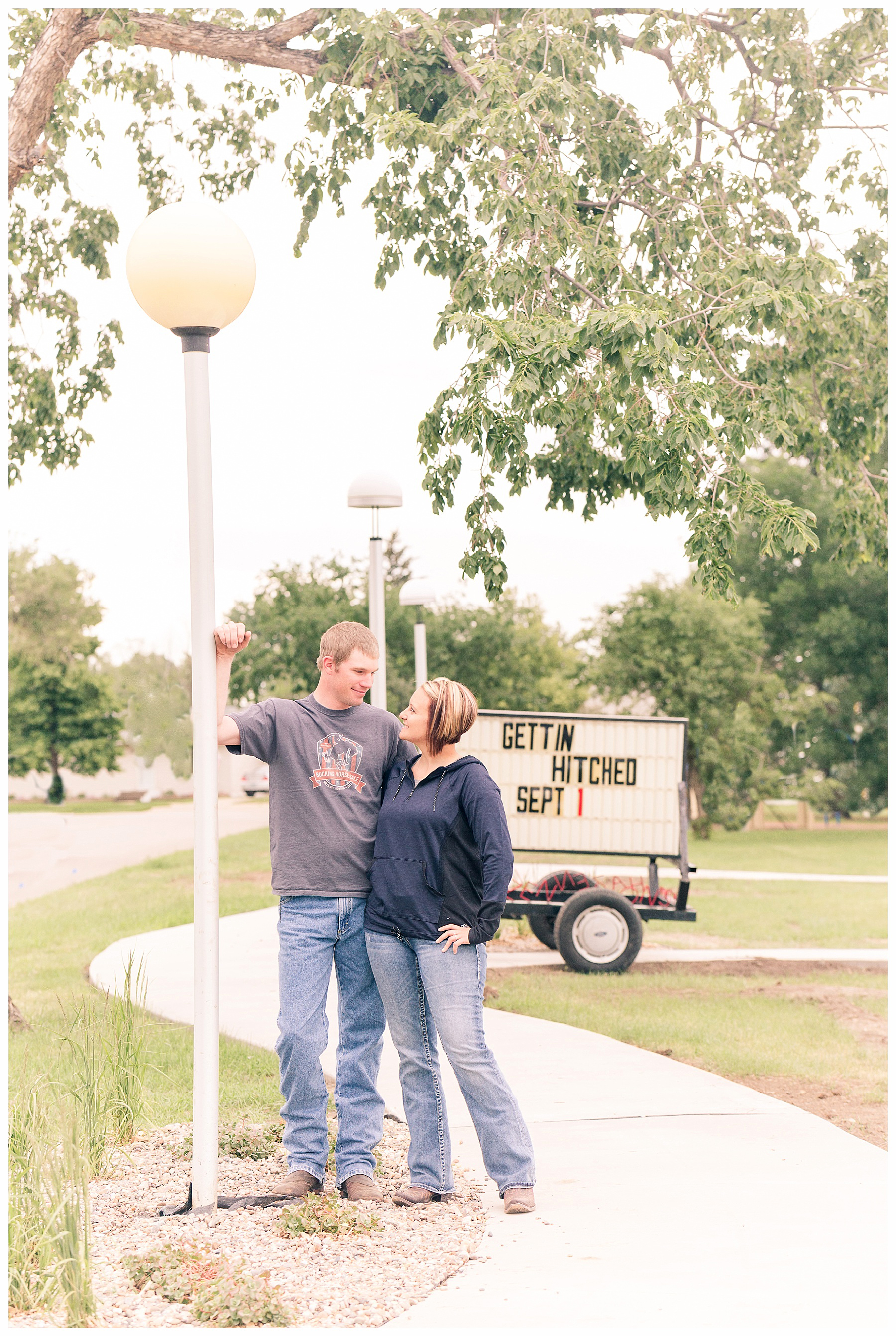 As we made our way downtown, I just had to ask if they would experiment with me a little at the newly re-landscaped Heritage Park and the addition of the winding walking path. I love that the recently installed street lamps are recycled from our old hospital! And only in a small town, can you have a special sign made just for you! While we were there, some of our local volunteers were putting up the sign for Music in the Park, but took a little detour and made one just for Monica and Garrett! How awesome is that? Hazen’s done a great job making our little town so pretty!